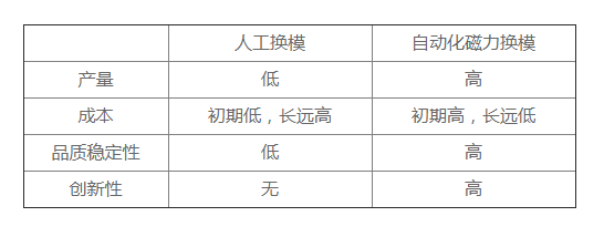自動化已成為當(dāng)今世界各國技術(shù)創(chuàng)新和經(jīng)濟(jì)發(fā)展競爭的焦點;從大家提及的自動化生產(chǎn)單元、自動化生產(chǎn)線、無人車間、黑燈生產(chǎn)、以及所謂的“機(jī)器換人”等話題皆為自動化,似乎工廠無自動化設(shè)備就不與時俱進(jìn)了。當(dāng)然注塑機(jī)磁力換模也由傳統(tǒng)換模方式【人工換?!扛倪M(jìn)為【自動化磁力換模】了,下面表格為人工換模與自動化注塑機(jī)磁力換模的對比: